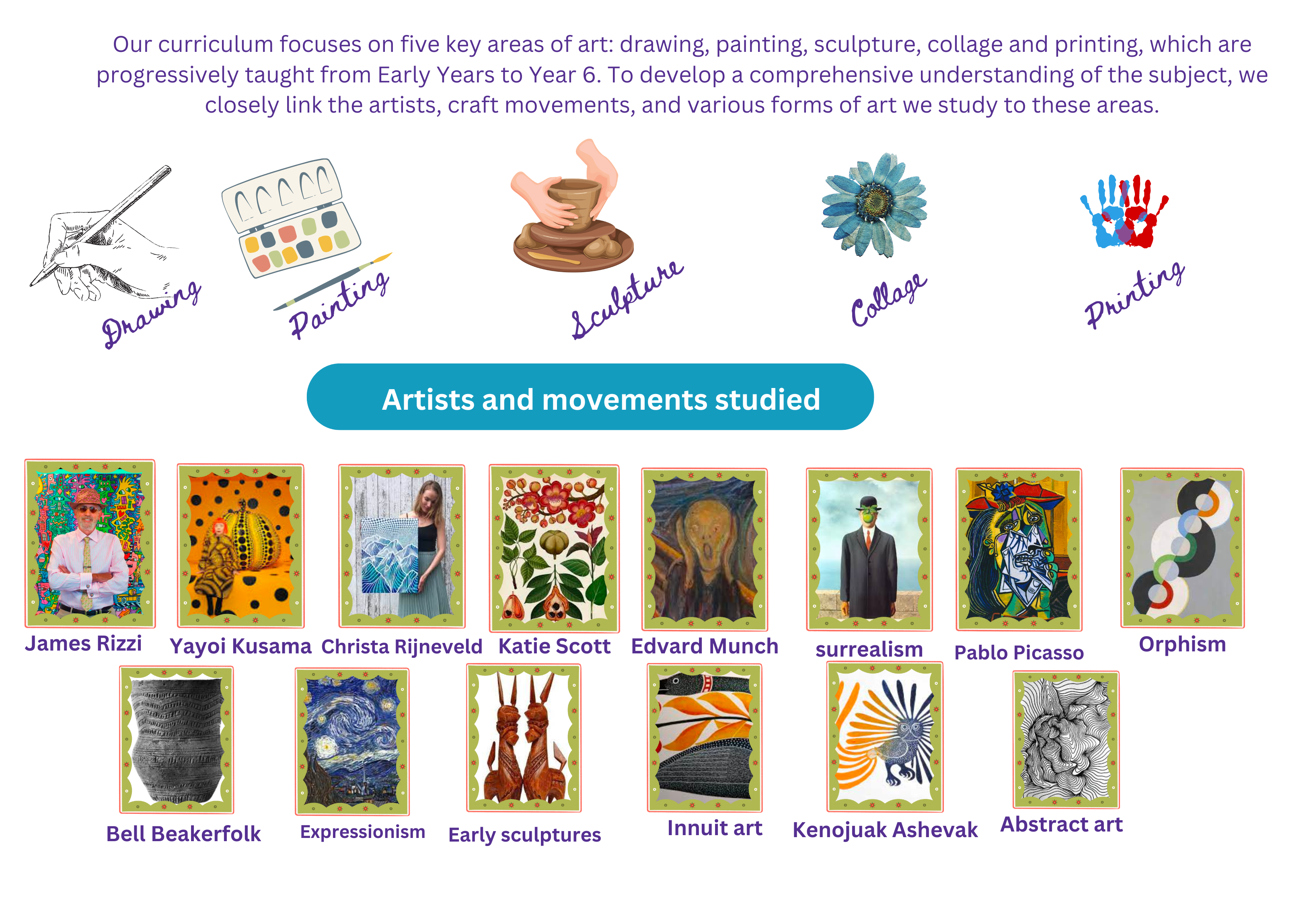 | Reception | Drawing human form. Developing painting skills | Digital art and print making | refining drawing skills. Revision of colour mixing. clay skills | Patterns and print making | collage work | making models |