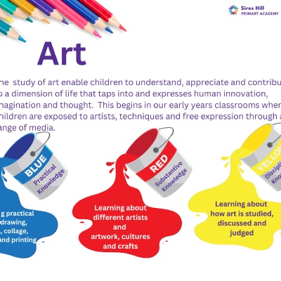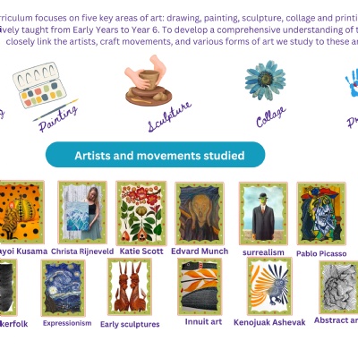 We value Art and Design as an important part of the children’s entitlement to a broad and balanced curriculum. Art and Design provides children with the opportunity to develop and extend skills and knowledge, and an opportunity to express their individual interests, thoughts and ideas. Art, craft and design embody some of the highest forms of human creativity. A high quality art and design education should engage, inspire and challenge pupils, equipping them with the knowledge and skills to experiment, invent and create their own works of art, craft and design. As pupils progress, they should be able to think critically and develop a more rigorous understanding of art and design. They should also know how art and design both reflect and shape our history and contribute to the culture, creativity and wealth of our nation. We want our children to use the local area as inspiration, to learn from other cultures and to respect diversity. We have carefully selected a wide range of artists, craft makers and designers for children to study. Children will develop their understanding of the visual language of art with effective teaching and considered sequences of lessons and experiences. Understanding of the visual elements of art and design will be developed by providing a curriculum which will enable children to reach their full potential. Implementation The skills and knowledge that the children will learn throughout each art topic are mapped across each year group, beginning in Early Years, and are progressive throughout the school.