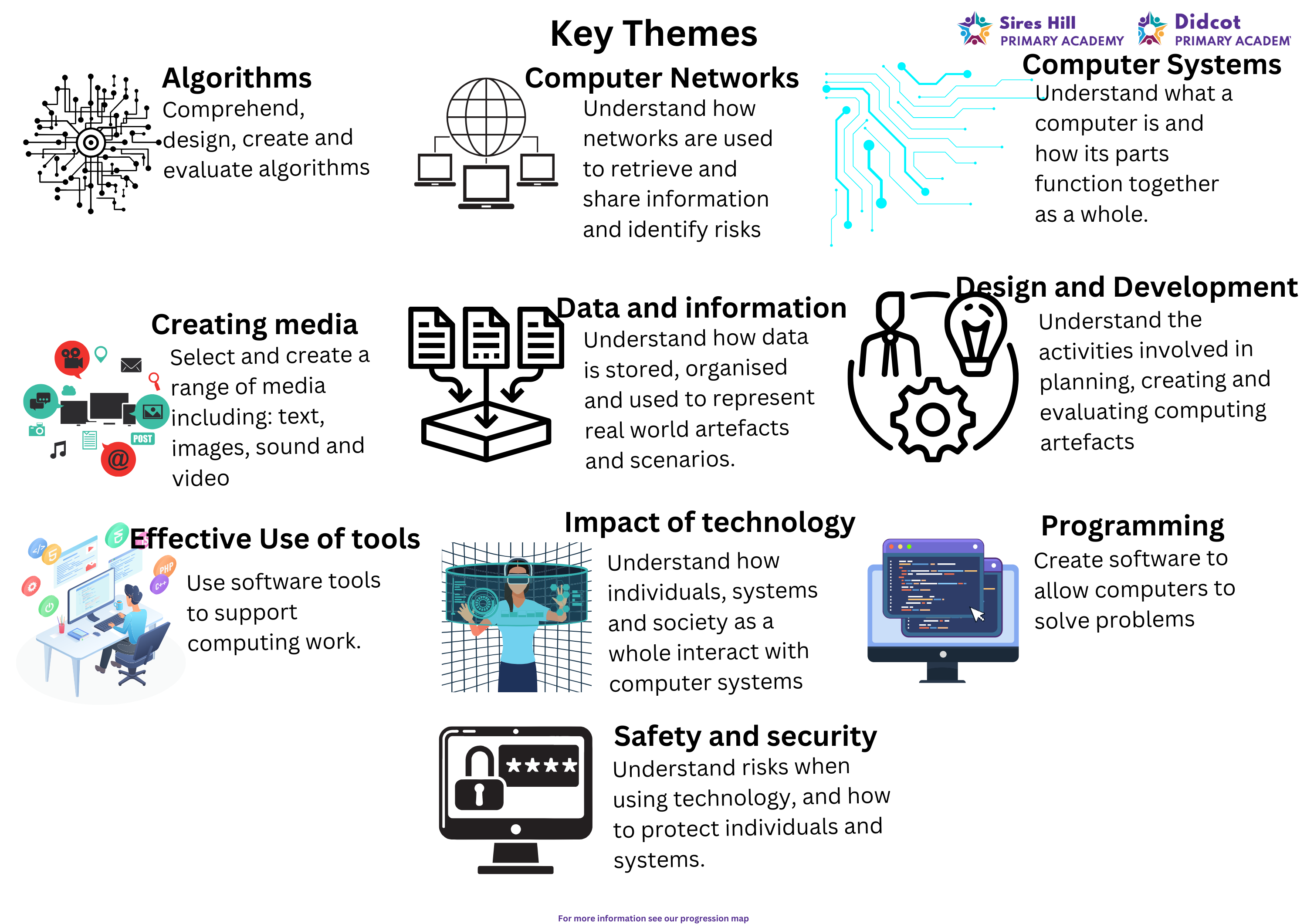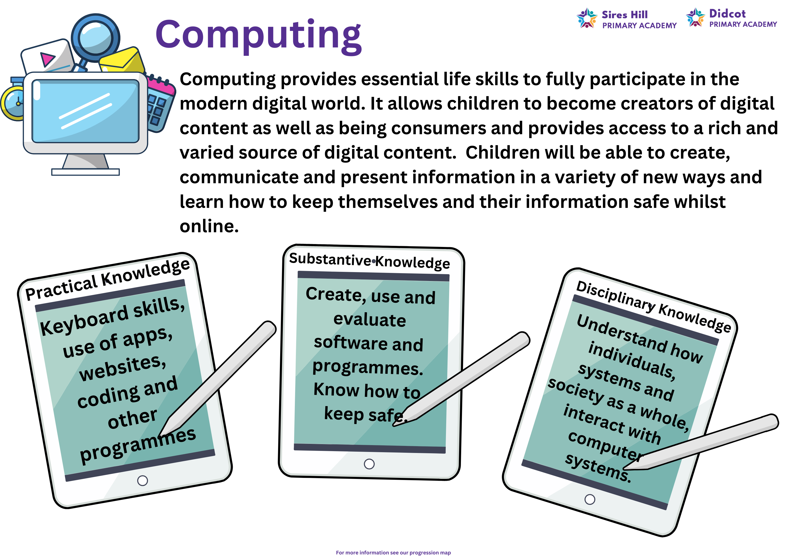 At Sires Hill Primary Academy, we intend to expose children to a range of technology and its wide variety of uses. Units are based around computing systems and networks, creating media, programming, data and information. We follow lesson from ‘Teach Computing’, a scheme with full links to the national curriculum built around an innovative progression framework. Children have lessons every week and throughout the year work with i-pads, beebots and chrome books to develop their skills.