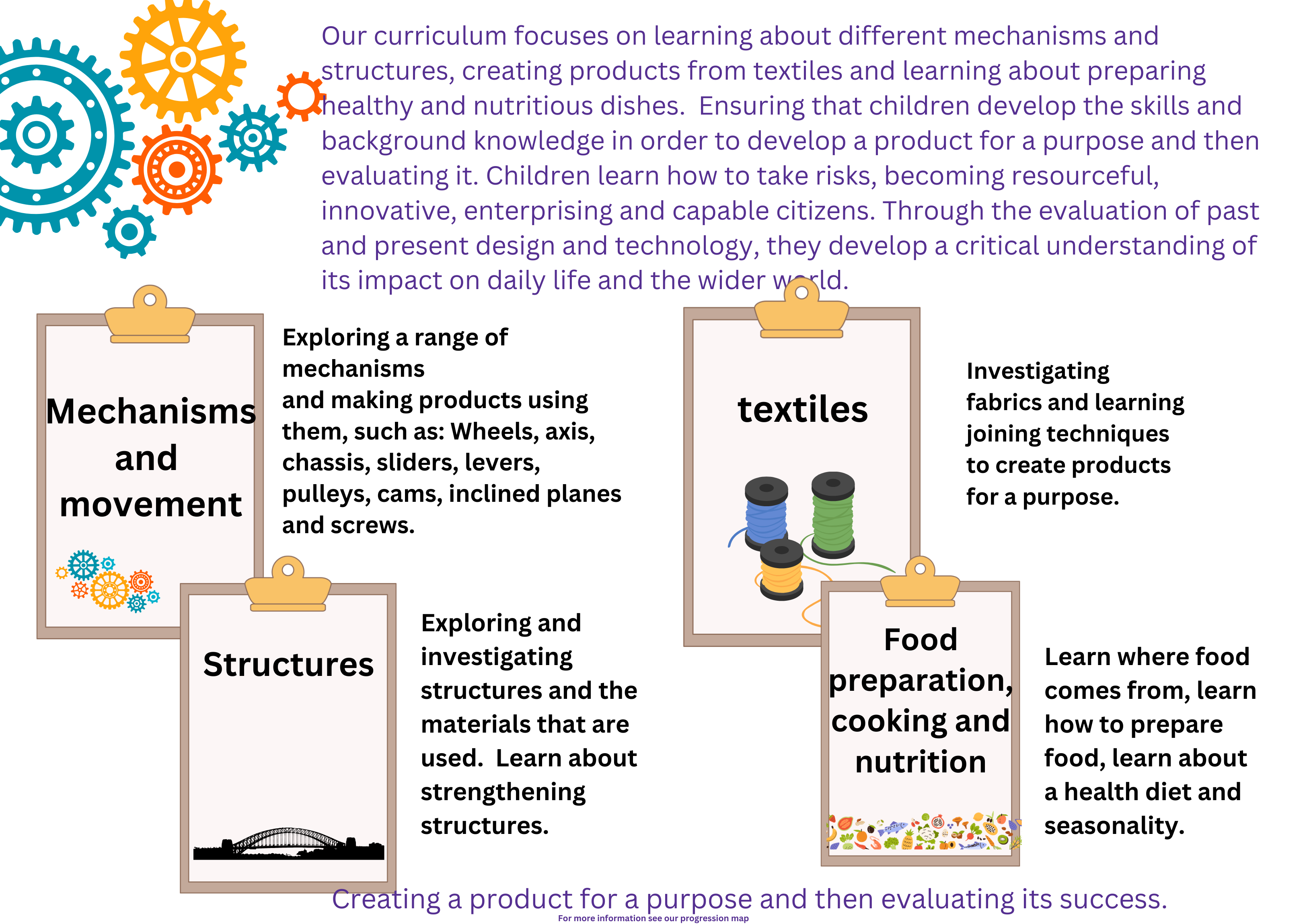 The skills and knowledge that the children will learn throughout each DT topic are mapped across each year group, beginning in Early Years, and are progressive throughout the school.