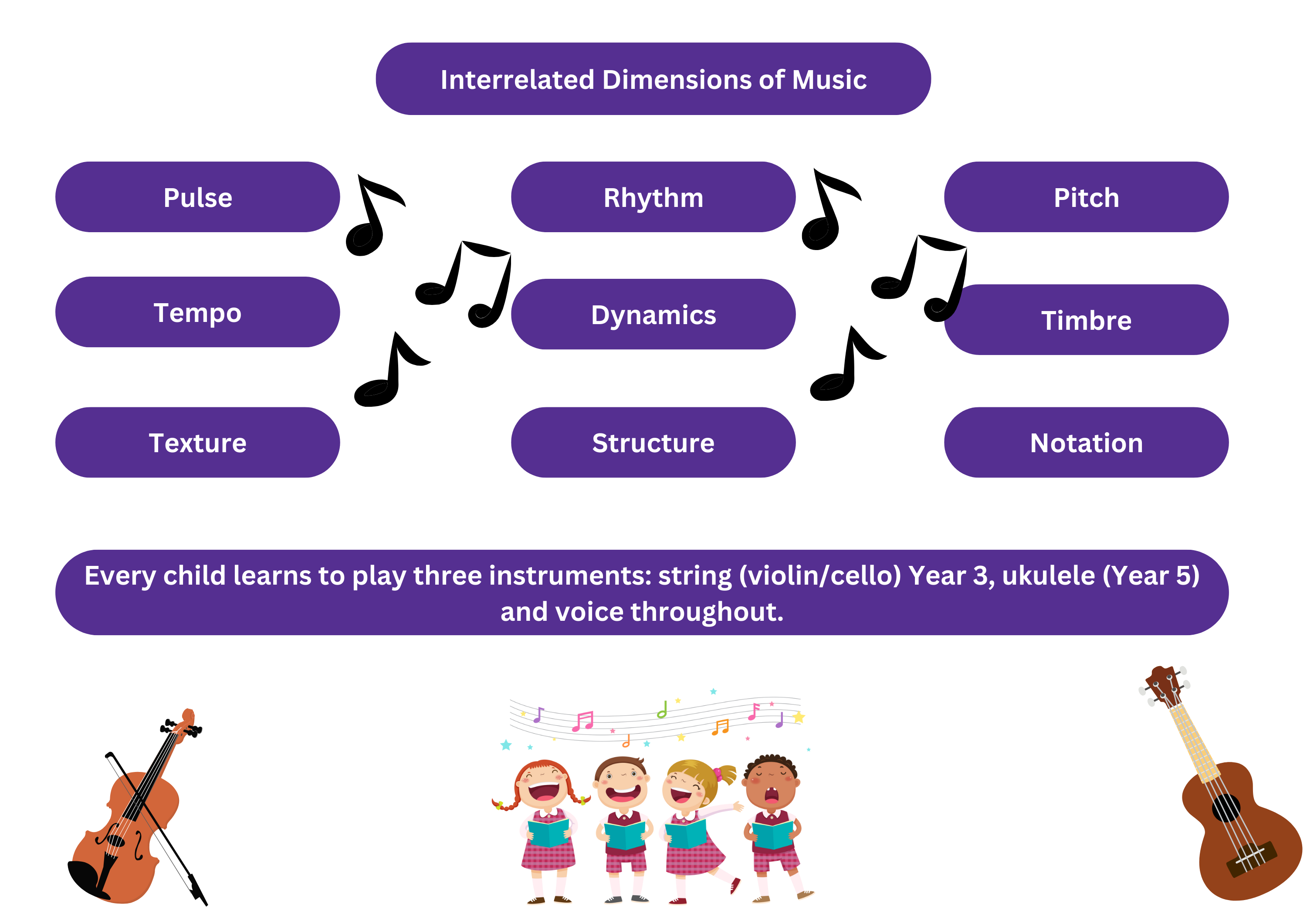 Every child throughout the school takes part in a music lesson every week, following our carefully planned scheme of learning. School assemblies also have planned listening that expose children to new pieces of music and also give opportunities for children to revisit prior learning and share knowledge with the peers from other year groups.