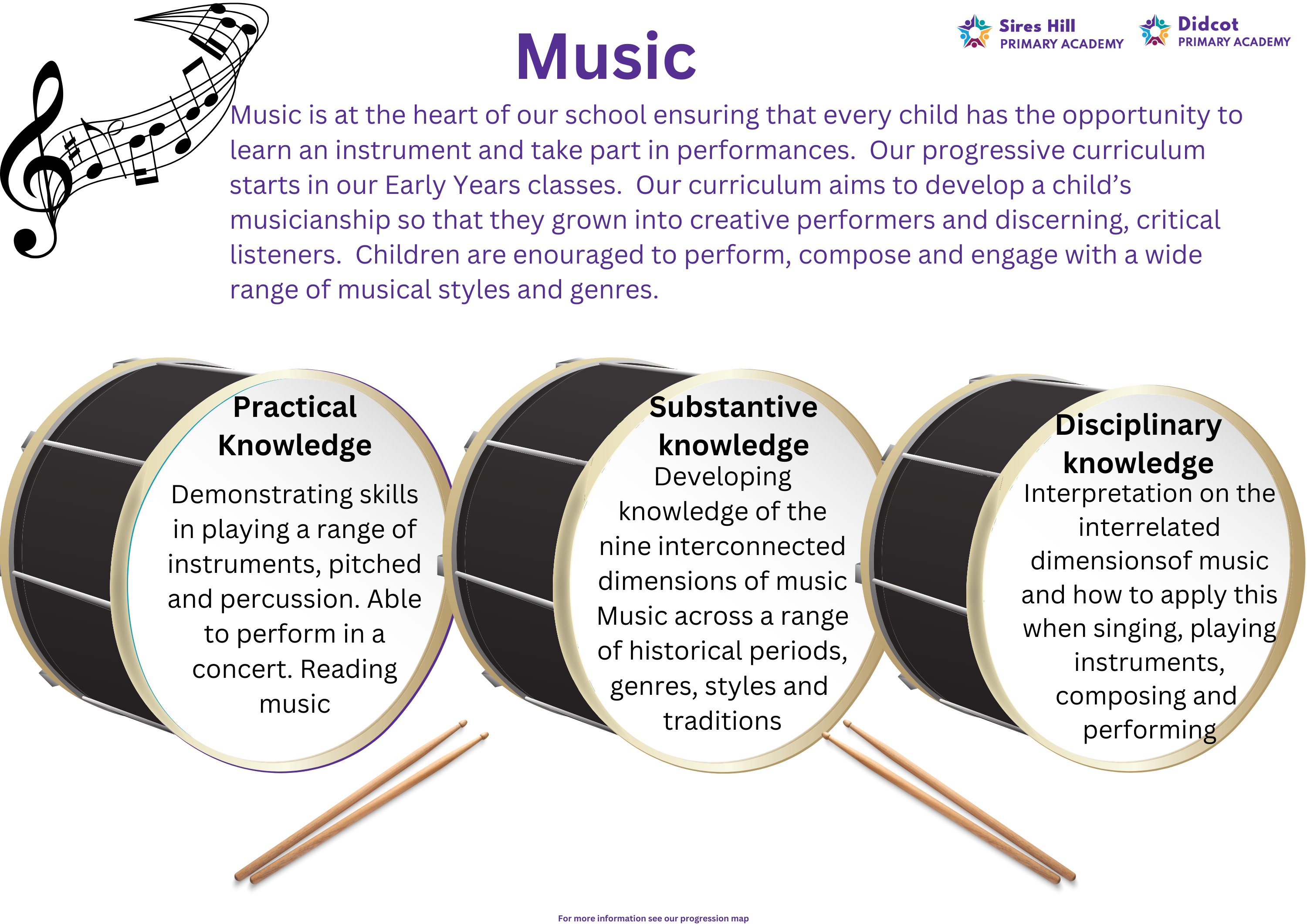 At Sires Hill Primary Academy we want to ensure that every child has access to high-quality, practical and engaging music experiences during class lessons and whole school/key stage experiences, along with a rich offering of wider opportunities.