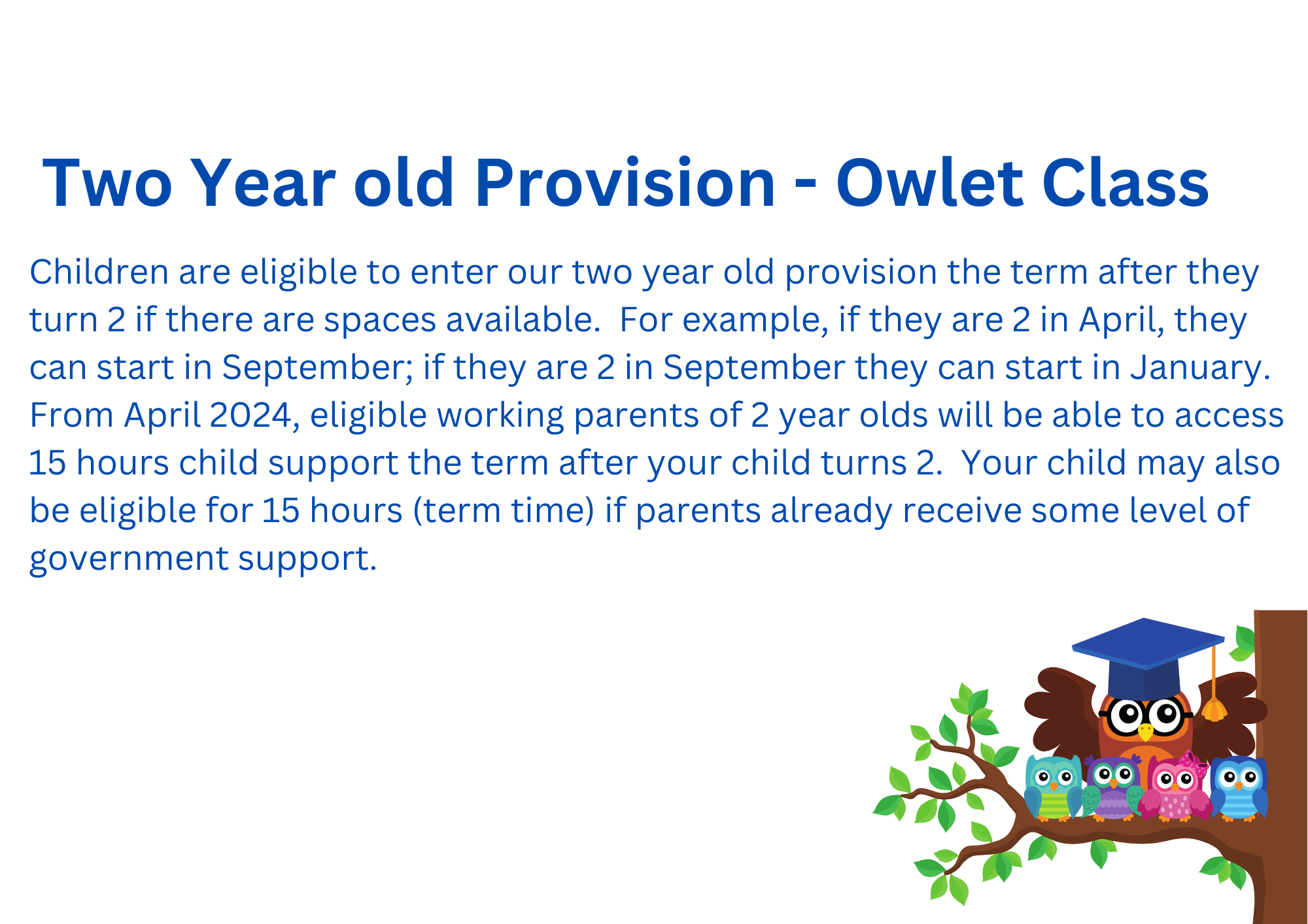 We also offer morning and afternoon spaces (15 hours a week) for those children whose parents do not qualify for 30 hours of childcare. Please note that sessions can not be split across different providers.